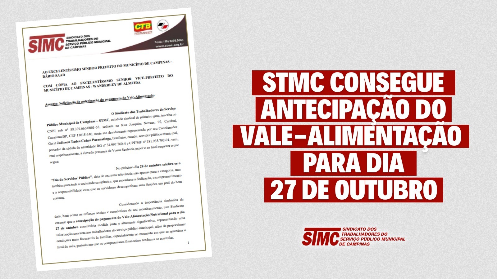 O Sindicato dos Trabalhadores do Serviço Público Municipal de Campinas (STMC) conseguiu a antecipação do crédito do Vale-Alimentação para a próxima segunda-feira (27) como forma de valorização dos companheiros e companheiras.