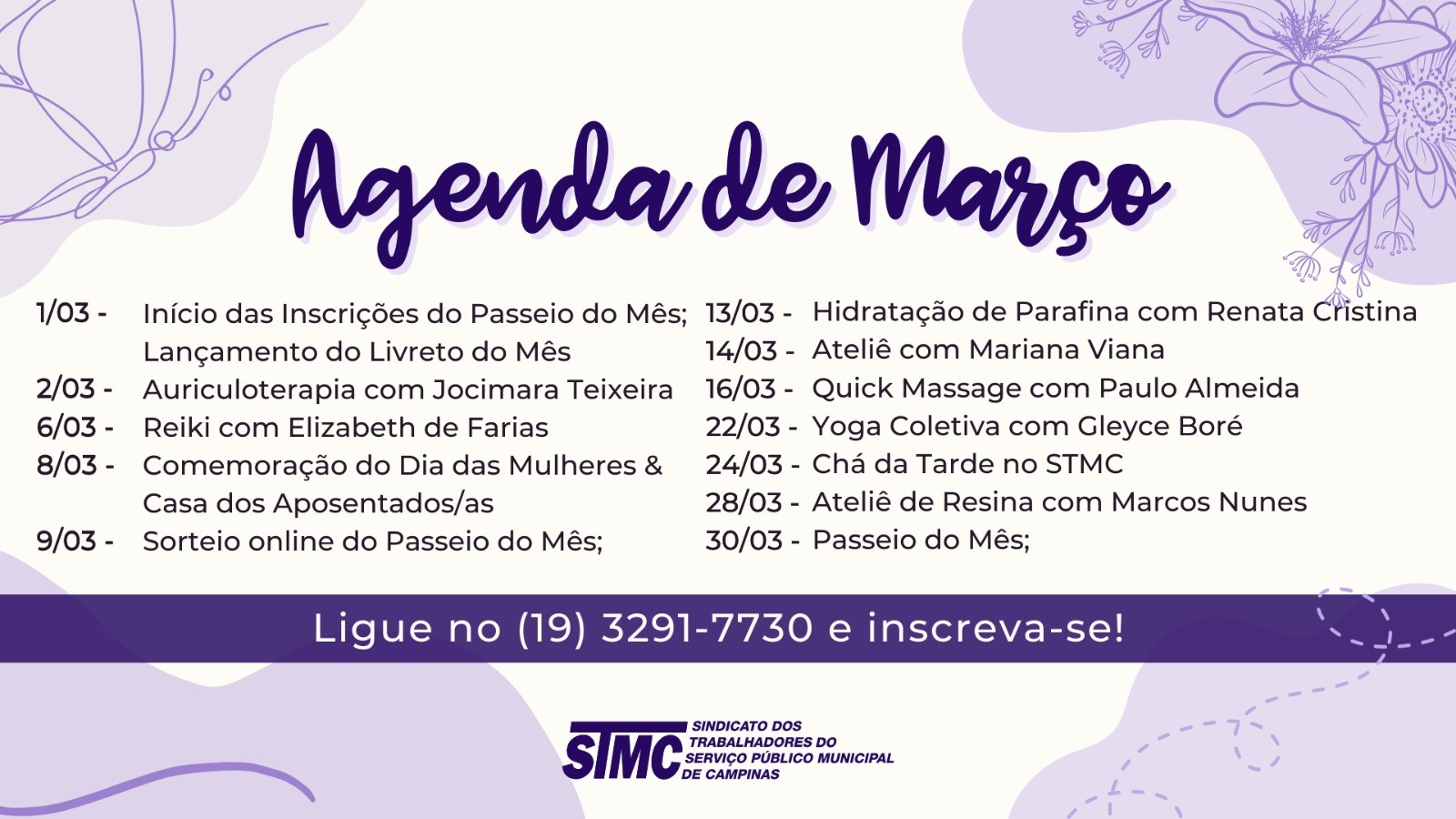 Hoje divulgamos a nossa Agenda do Mês de março que chega com muitas comemorações. Vamos celebrar junto com as nossas aposentadas e pensionistas o Dia Internacional da Mulher. Em 8 de março também vamos comemorar os quatro anos da Casa dos Aposentados.