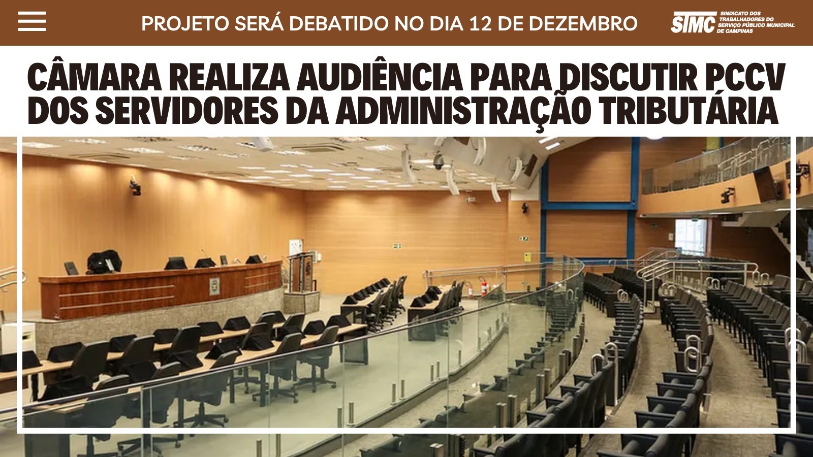 O Sindicato dos Trabalhadores do Serviço Público Municipal de Campinas (STMC) informa que a Câmara Municipal de Campinas agendou para o dia 12 de dezembro, às 10h, uma audiência pública para debater o Plano de Cargos, Carreiras e Vencimentos da Administração Tributária do Município de Campinas.