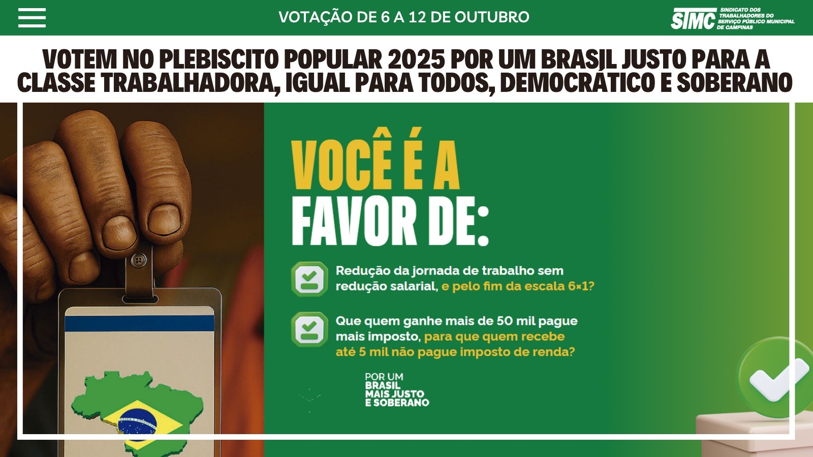 O STMC e a nossa central sindical CTB participam de um mutirão que começa nesta segunda-feira (6) e vai até o próximo domingo (12) para avançar na coleta dos votos. O Plebiscito Popular já tem mais de 1,5 milhão de votos registrados.