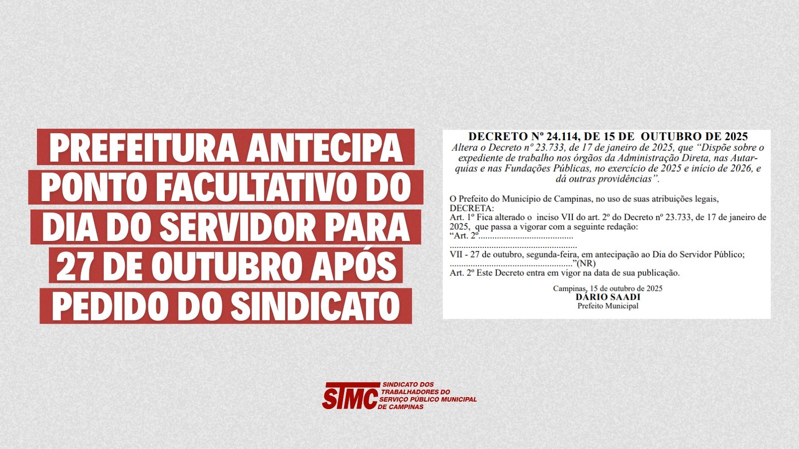 O Sindicato dos Trabalhadores do Serviço Público Municipal de Campinas (STMC) informa que CONQUISTAMOS a antecipação do ponto facultativo do Dia do Servidor de 28 de outubro (terça-feira) para 27, que é na segunda-feira. Dessa forma, os trabalhadores poderão emendar a comemoração da data que celebra a nossa categoria.