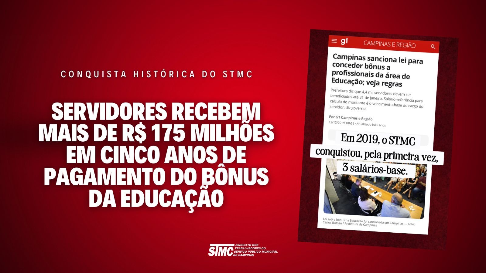 O Sindicato dos Trabalhadores do Serviço Público Municipal de Campinas (STMC) tem orgulho de ter CONQUISTADO PARA OS SERVIDORES MAIS DE R$ 175 MILHÕES em pagamento do Bônus da Educação em cinco anos.