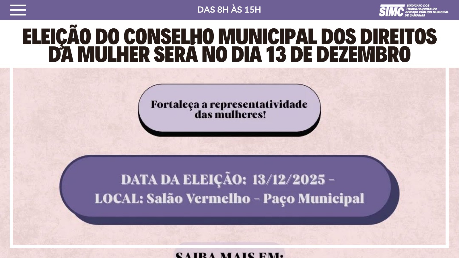 O Sindicato dos Trabalhadores do Serviço Público Municipal de Campinas (STMC) informa que será realizada no dia 13 de dezembro, das 8h às 15h, no Salão Vermelho da Prefeitura de Campinas, a eleição do Conselho Municipal dos Direitos da Mulher (CMDM).